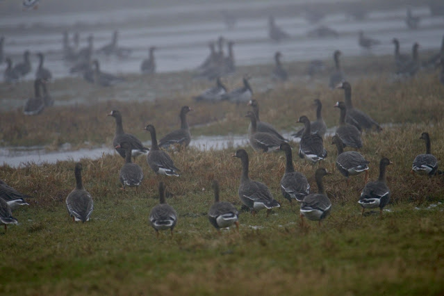 Gęsi we mgle. Stado składało się z gęgaw i bernikli białolicych.